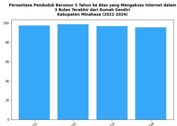 Perkembangan Persentase Penduduk Berumur 5 Tahun ke Atas yang Mengakses Internet dalam 3 Bulan Terakhir dari Rumah Sendiri Kabupaten Minahasa Tahun 2021-2024